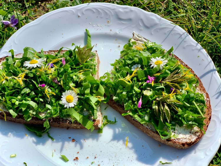 Oooh jaaa, echt jetzt und mein voller Ernst. Ehrlich! …hmmm happs !!! Es gibt fast nix auf’m gesamten Planeten Erde, was mir leckerer schmeckt und mich happier macht, als ein frisches, bunt und üppig bestücktes Wildpflanzenbrot mit ein paar Spritzern Zitrone obendrauf, …einfach herrlich !!! Für mich „ZumAufDerWieseNiederknienGenial“.